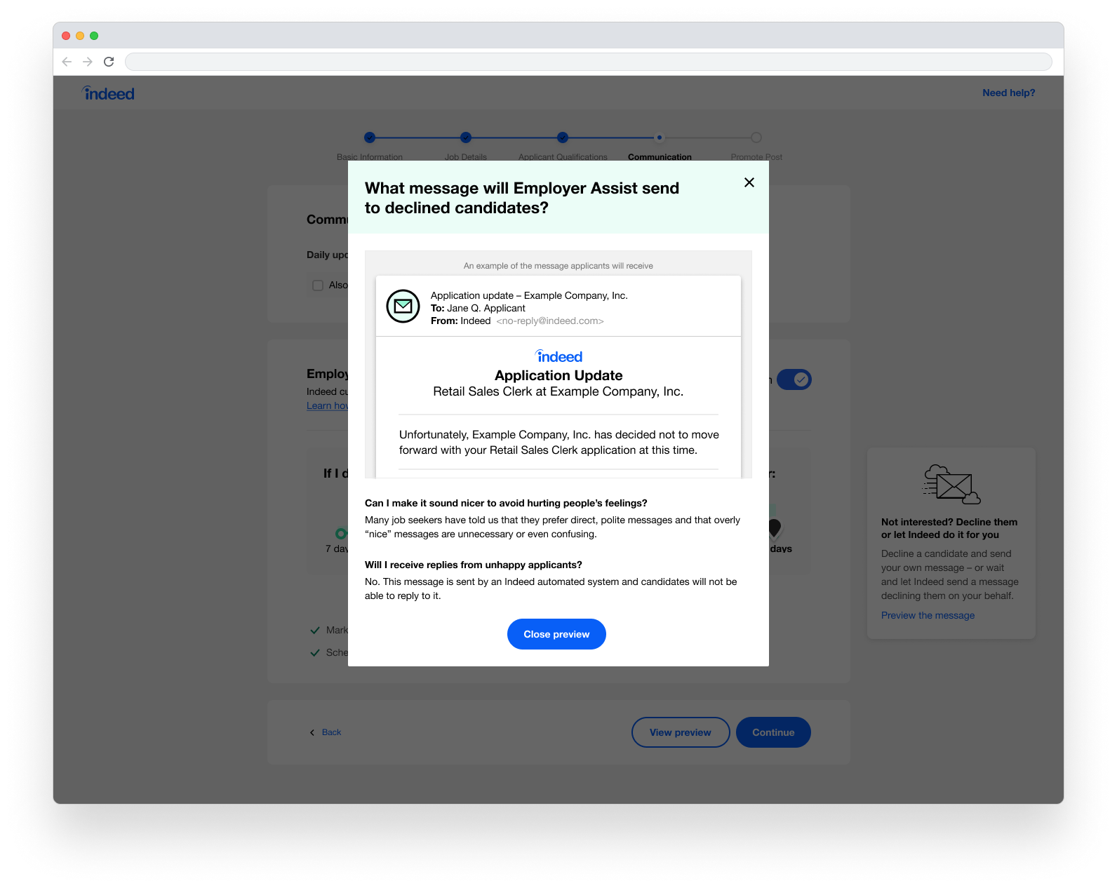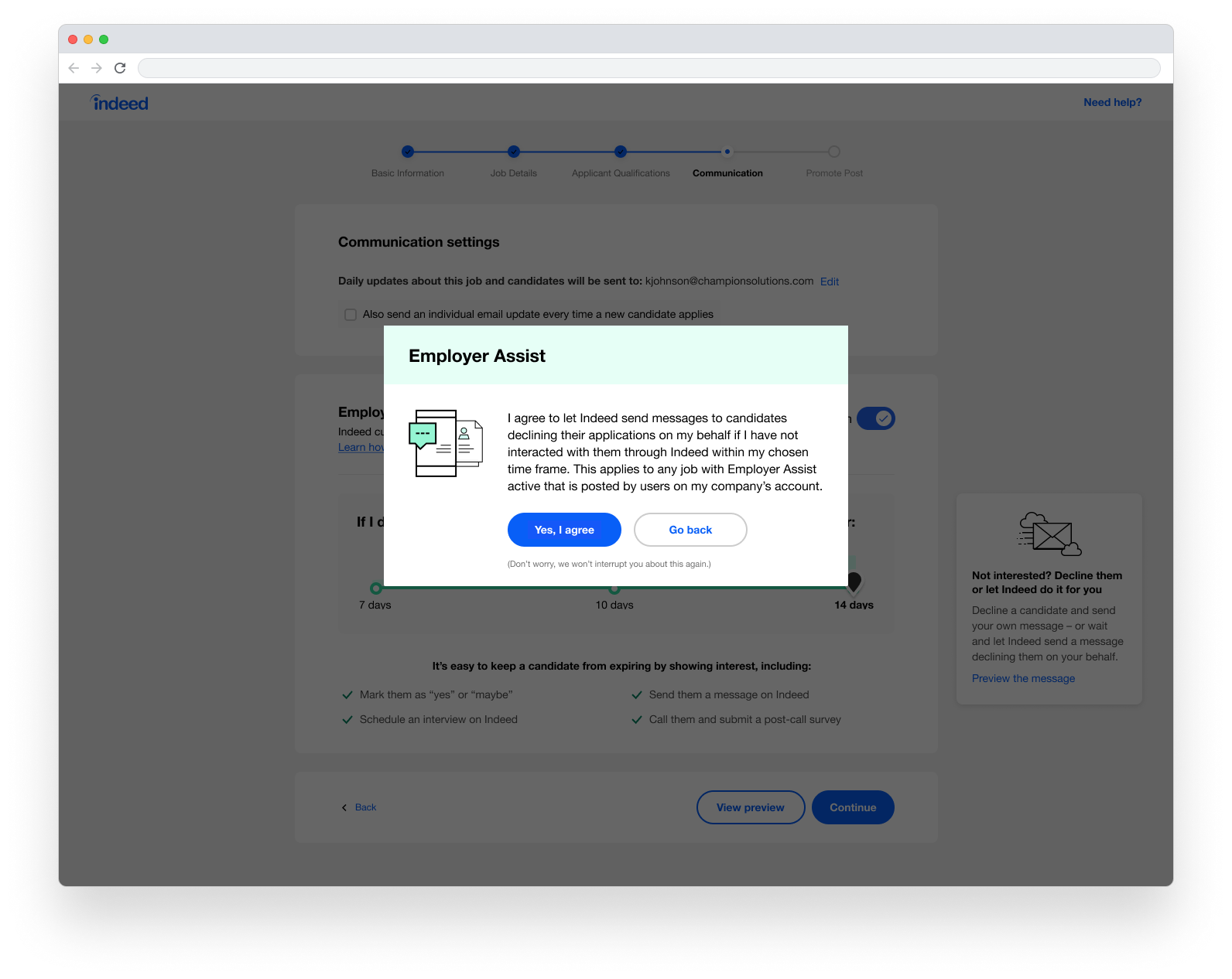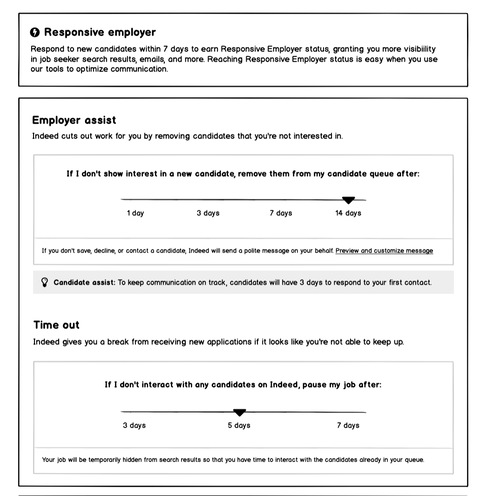 When posting a new job, make an agreement between the user and Indeed that they will respond to new applications within a time frame of their choosing. If they do not take action on a new application, Indeed will assume they are not interested in the candidate, automatically decline them, and remove them from the employer’s list of active candidates.